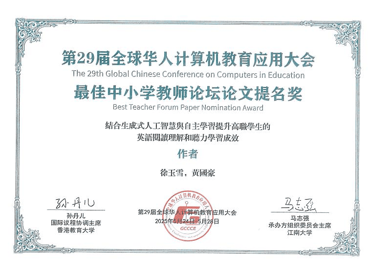 第29屆全球華人計算機教育應用大會最佳中小學教師論壇論文提名獎