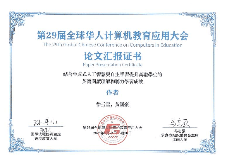(中央社訊息服務20250702 17:59:01) 光華高工科技輔助教學十年有成 教師國際研討會發表成果獲肯定