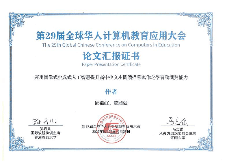 第29屆全球華人計算機教育應用大會論文匯報證書